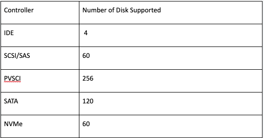 VMware ortamlarında sanal makineler için kullanılabilen çeşitli depolama denetleyicisi türleri bulunmaktadır. VMware vSphere sanal makinelerinde desteklenen başlıca depolama denetleyicileri; SCSI, IDE, AHCI tabanlı SATA ve NVM Express (NVMe) olarak sıralanabilir.