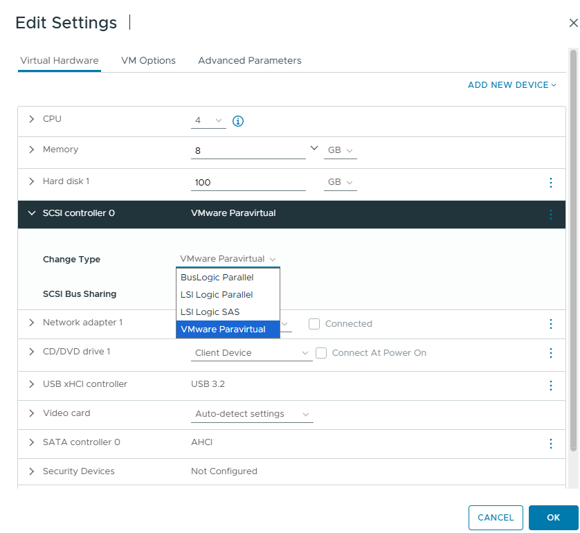 buslogic→ BusLogic SCSIlsilogic→ LSI Logic Parallellsisas1068→ LSI Logic SASpvscsi→ VMware Paravirtual SCSI