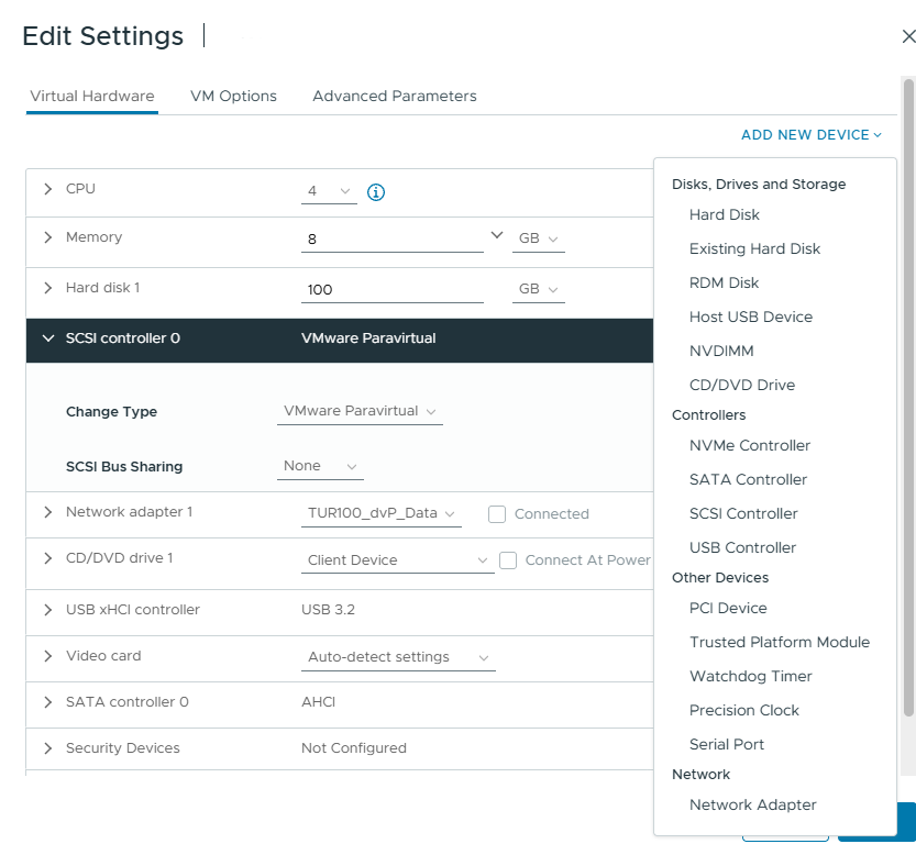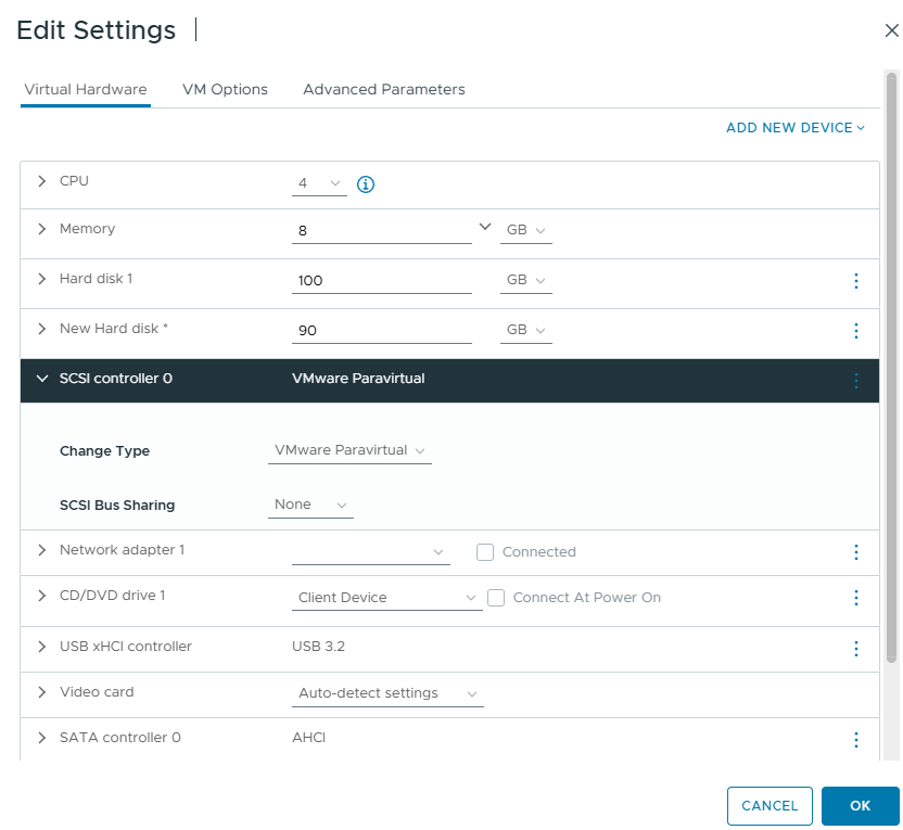 Not: Eğer bir sanal makineye fiziksel bir USB aygıtını (örneğin USB harici disk veya USB bellek) doğrudan bağlamak istiyorsan, USB Controller eklenmelidir. Bu işlem USB pass-through yöntemiyle yapılır ve kullanılacak USB aygıtının ESXi host üzerindeki fiziksel bir USB portuna takılı olması gerekir.